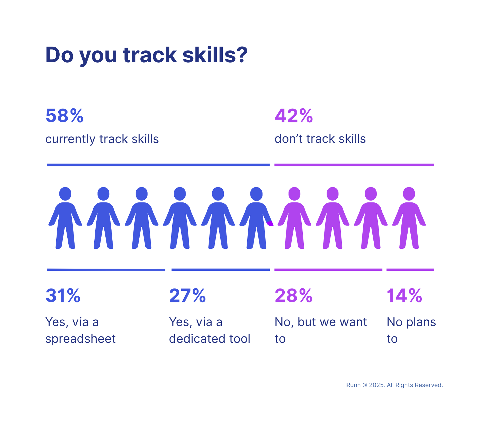 Skills-based planning is key to team resource planning. According to our research, almost half (42%) of organizations don’t track their people’s skills.