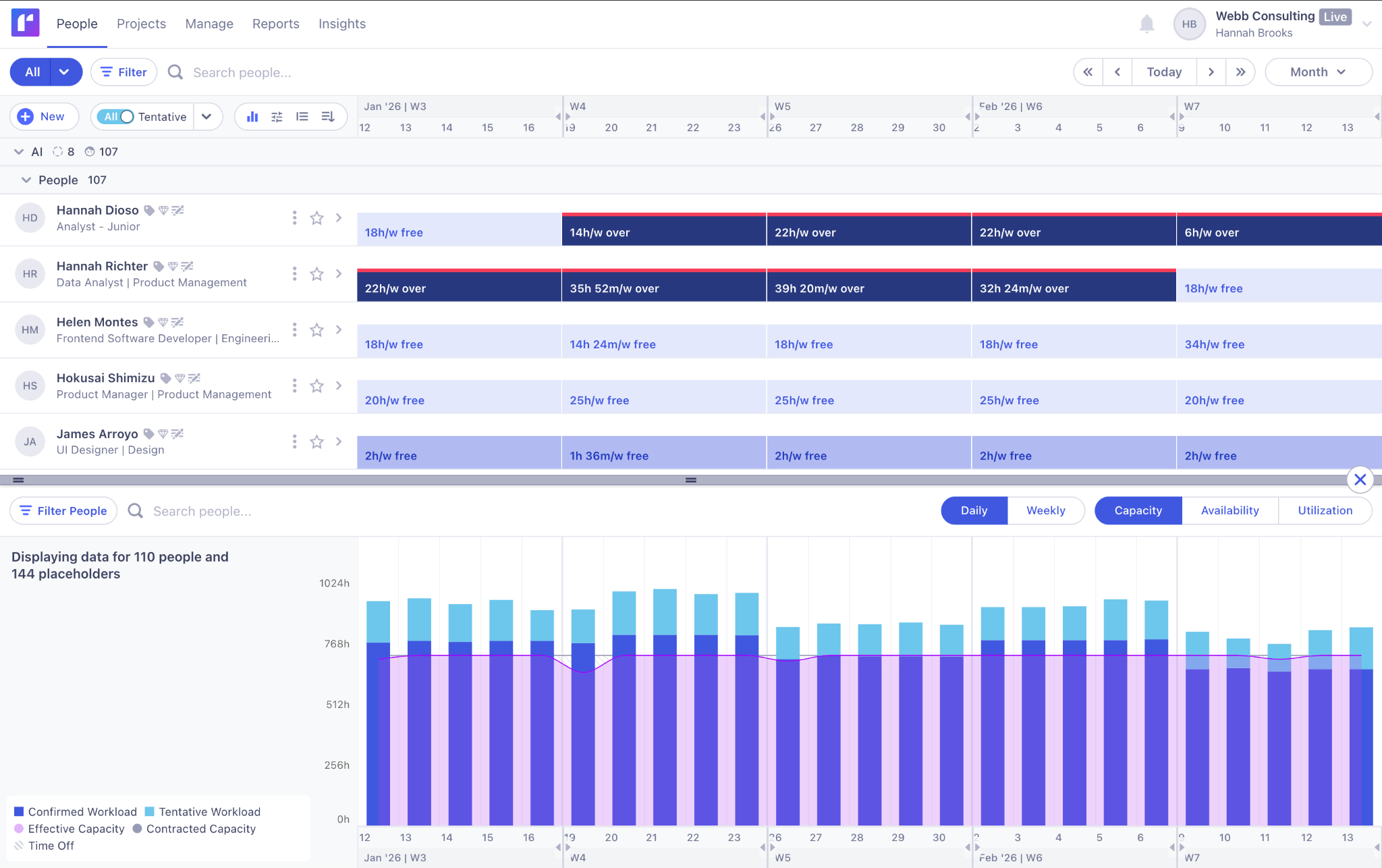 The People Planner is user-friendly and highly visual, with drag-and-drop allocation. Benefit from helpful insights insight resource capacity, availability, workload, project variance, and clashes.