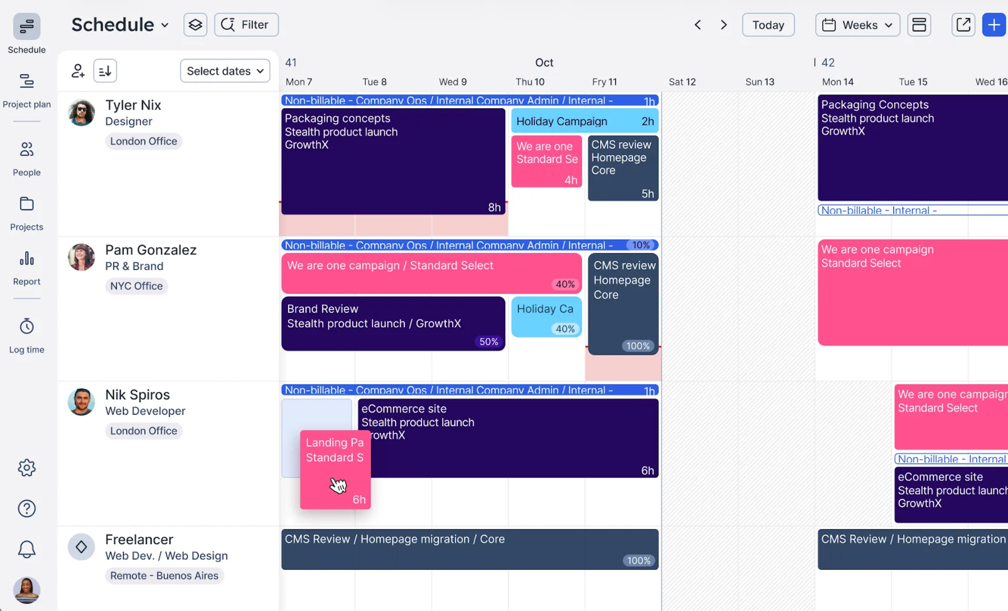 Runn comes with a range of free resource planning tools to help managers see their team’s resource capacity, including skills and team capabilities. You get a bird’s-eye-view of all resources across multiple projects and can easily allocate people to the right work.