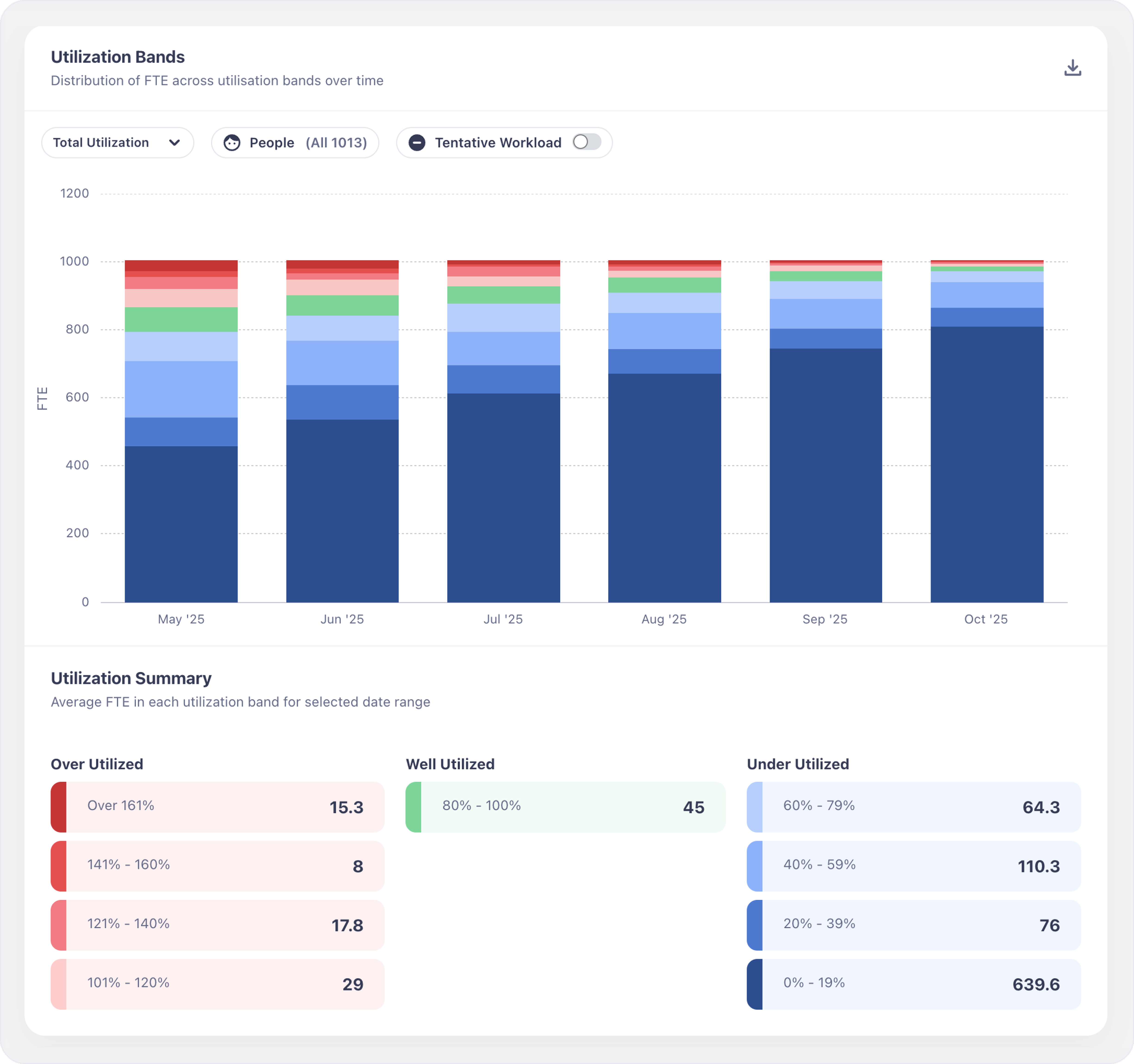 Capacity forecasting with financial context. You can see how ongoing projects and upcoming deals will impact future capacity. Helping teams make confident hiring or outsourcing decisions.