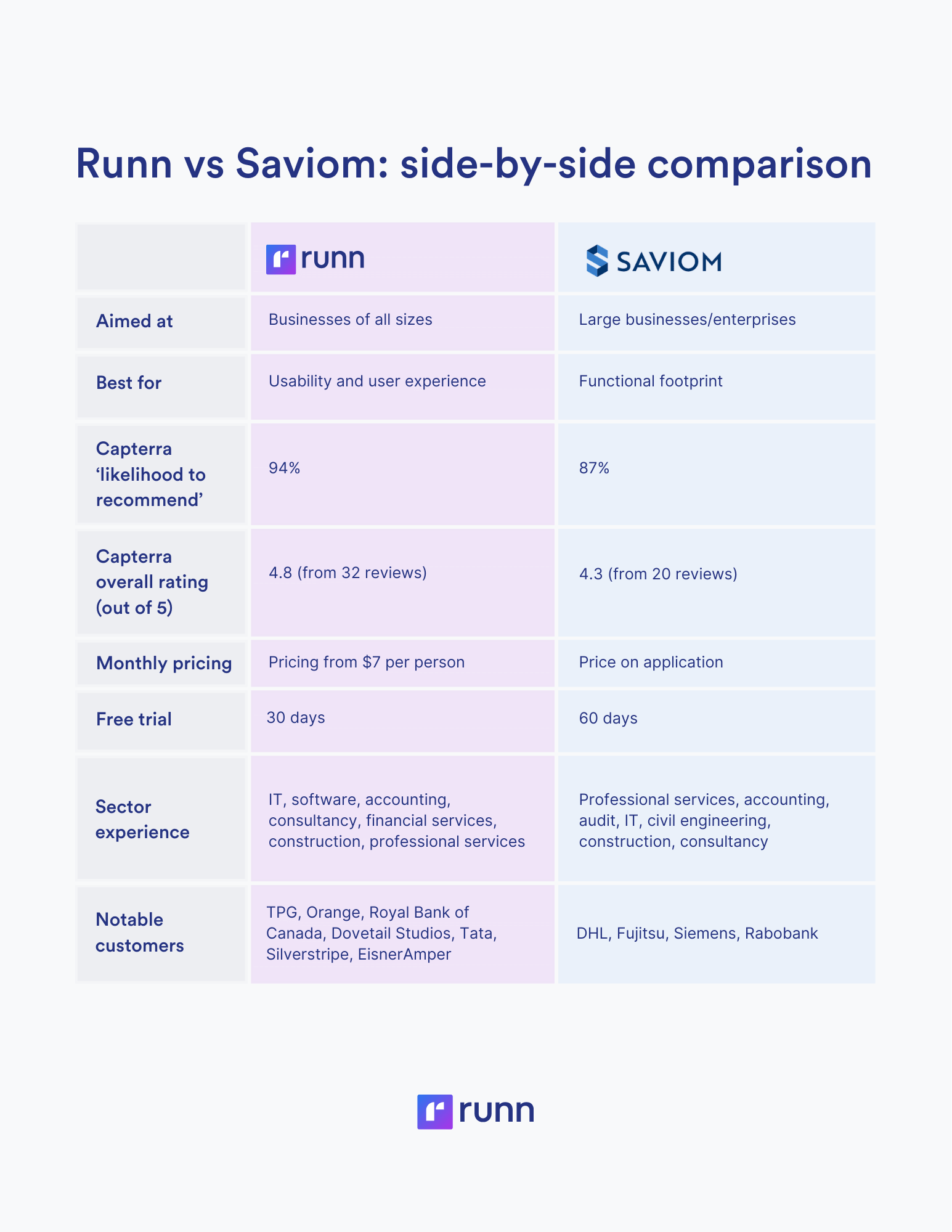 Runn vs Saviom: which is best for resource management? Although you’re reading this on the Runn site, we’re not going to just claim the title. The truth is, it depends on your specific needs.